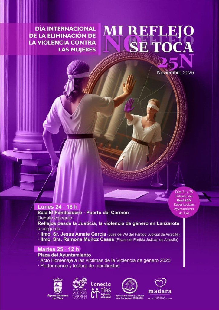 El día 24 de noviembre  en la Sala del Fondeadero de  Pto. del Carmen, a las 18:00 horas habrá un debate-coloquio” Reflejos desde la Justicia, la violencia de género en Lanzarote” a cargo de Don Jesús Amate García, Juez  de VG del Partido Judicial de Arrecife y Doña Ramona Muñoz Casas, Fiscal del Partido Judicial de Arrecife.